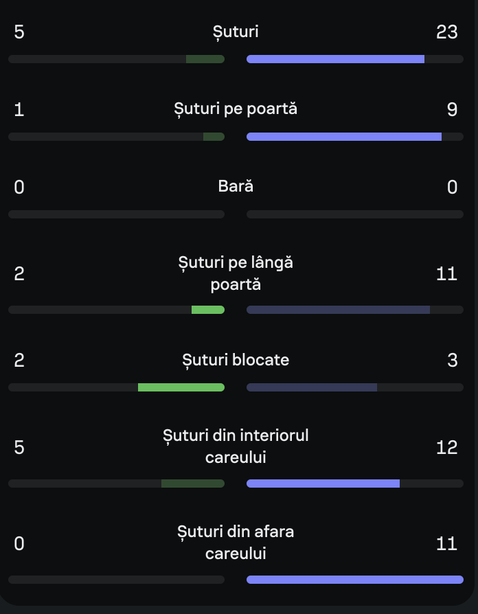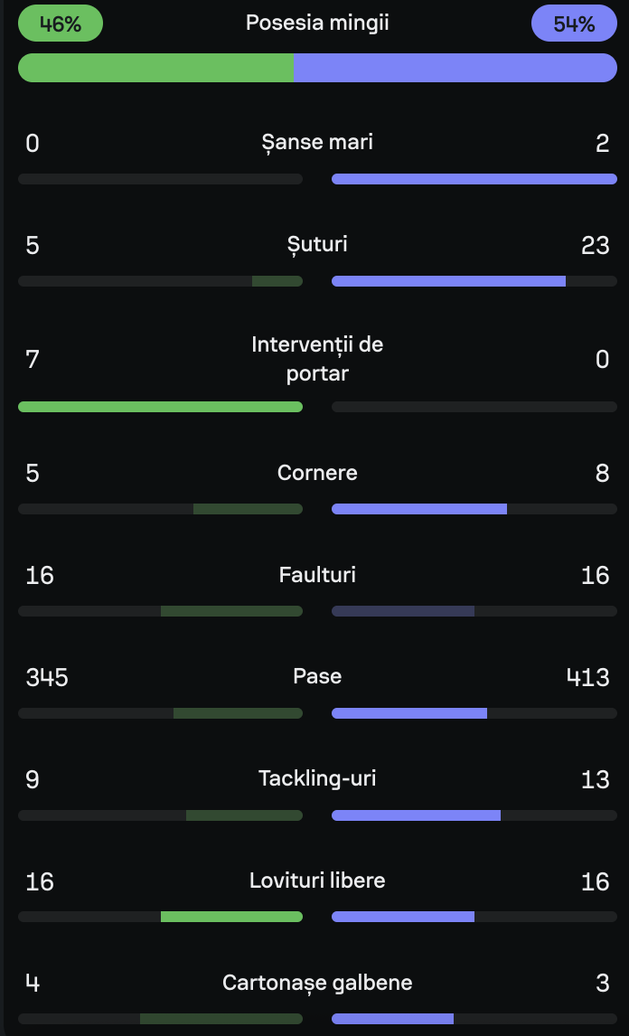 Oamenii lui pancu au pierdut cât se poate de clar, orice duel. Apă, sol, aer, aproape totul a fost în favoarea gazdelor. La nivelul careului, slovacii s-au impus în 53% din cazuri(38 din 67 de dueluri câștigate) în timp ce ai noștri se bazează pe restul de 43 de procente(29 din 67). Înalți ca brazii, slovacii au tot 57% procente și când vine vorba de bătăliile în aer( 8 din 14 dueluri le-au revenit lor), noi tot cu ăia 43 la sută(ceea ce s-a traduce în cifre- 6 din 14 câștigate). Ba ne-au și driblat mai mult. 9 din 14 driblinguri le-au revenit lor, adică 64% în timp ce foștii brazilieni ai Europei au un procentaj de reușită a driblingurilor de doar 29%, adică 4 reușite din 14 încercate.