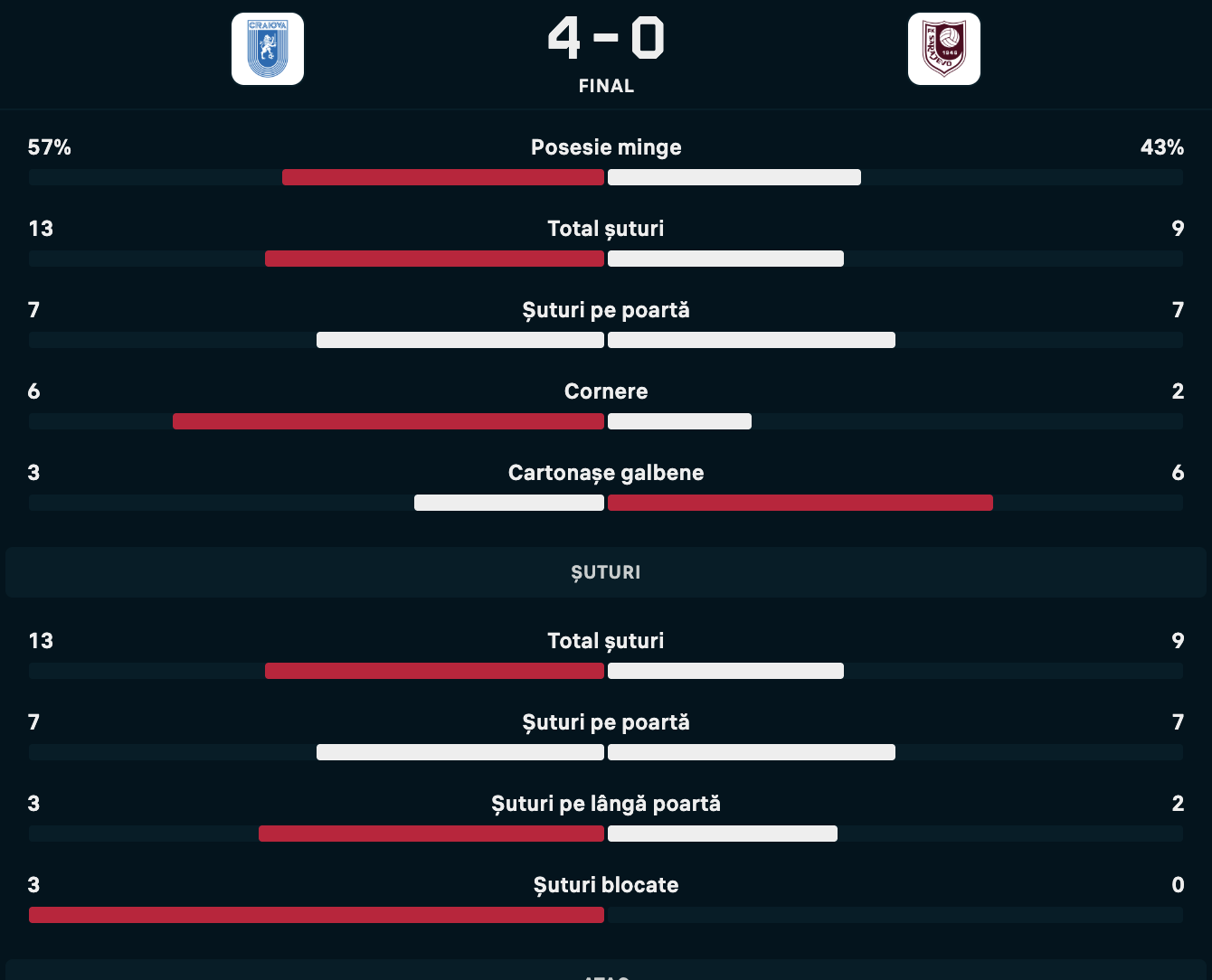 Nu am reglat decât foarte puține lucruri la pauză. Le-am explicat că va fi o chestiune de timp până marcăm primul gol, dacă își păstrează pozițiile. Nu aveau cum să acopere zonele create de noi. Am făcut pressing în 4-4-2 și noi i-am surprins cumva”, Mirel Rădoi-antrenor Universitatea Craiova
